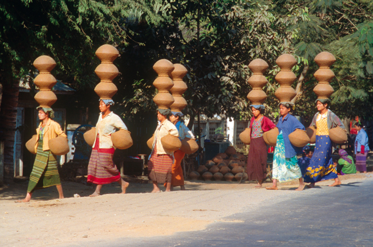Eine Gruppe von Frauen trägt aufeinandergestapelte Tongefäße,