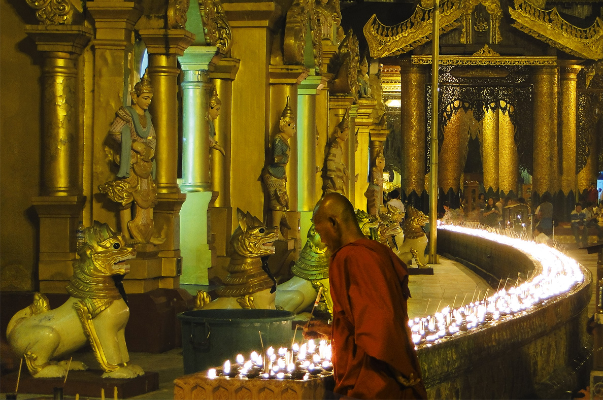 Ein Mönch in der Shwedagon-Pagode zündet Kerzen